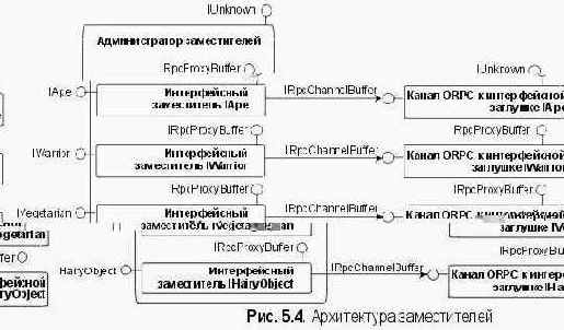 Это создает у клиента иллюзию, что все интерфейсы выставляются одним СОМ-объектом. На рис. 5.4 показаны отношения между администратором заместителей, интерфейсными заместителями и заглушкой.